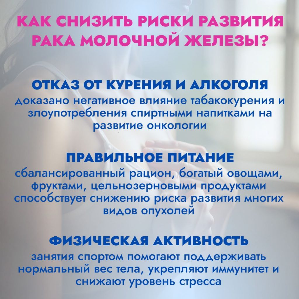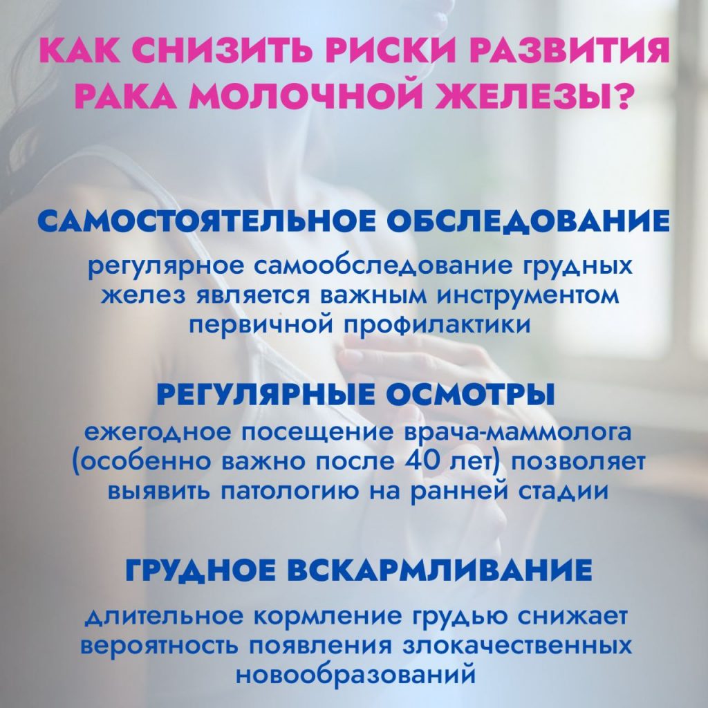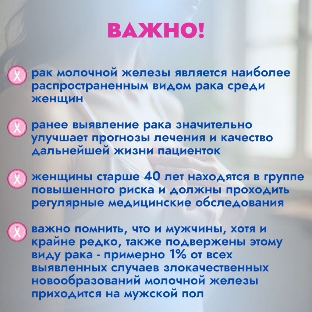 С 13 по 19 октября 2025 в регионе проводится Неделя борьбы с раком молочной железы (в честь месяца борьбы с раком молочной железы) Рак молочной железы – одно из самых распространённых онкологических заболеваний, регистрируемых среди женщин. По статистике заболеть рискует каждая восьмая женщина. Рак молочной железы — серьезное заболевание, однако оно излечимо при условии своевременно начатого лечения. Не бойтесь обращаться к врачу, регулярно обследуйтесь и ведите здоровый образ жизни. Помните, ваша жизнь и здоровье зависят только от вас самих.