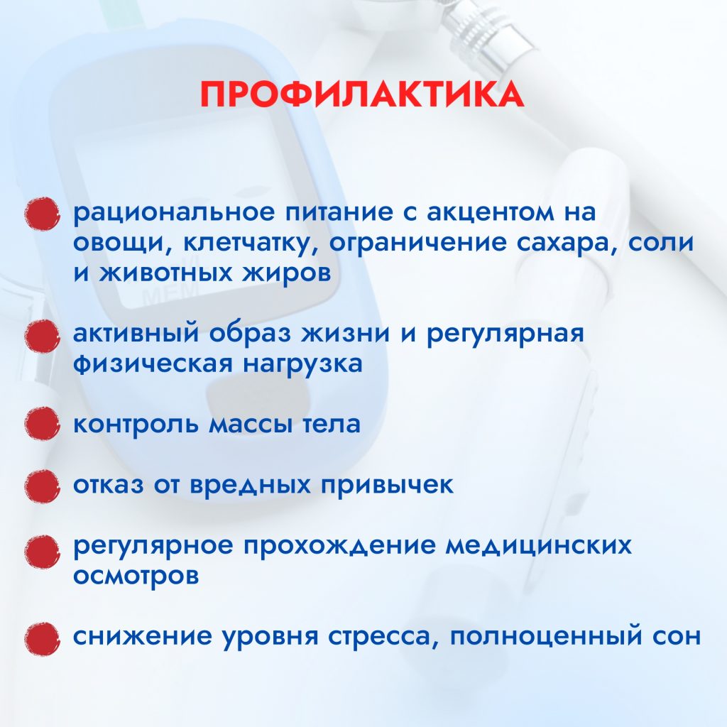 С 10 по 16 ноября 2025 проводится Неделя борьбы с диабетом (в честь всемирного дня борьбы с диабетом 14 ноября)Диабет — это хроническая болезнь, развивающаяся в тех случаях, когда поджелудочная железа не вырабатывает достаточно инсулина или когда организм не может эффективно использовать вырабатываемый им инсулин. Инсулин — гормон, регулирующий уровень содержания сахара в крови.Основными факторами риска развития диабета являются генетическая предрасположенность, возраст, лишний вес, неправильное питание и отсутствие физической активности.Если болезнь не контролировать, повышенный уровень глюкозы медленно разрушает кровеносные сосуды и нервы, увеличивая риски инфаркта, инсульта, почечной недостаточности, потери зрения, нарушений мозгового кровообращения.